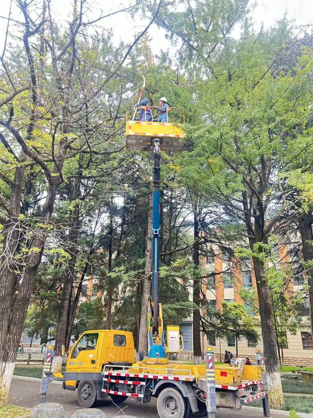 投入1台高空作业车,覆盖不同高度作业需求,油锯、枝剪等工具每日点检调校,确保“零故障”上阵。地面同步布设反光警示锥、安全警戒线及提示牌,并安排专人实时疏导,实现“人机隔离、警示全覆盖”。